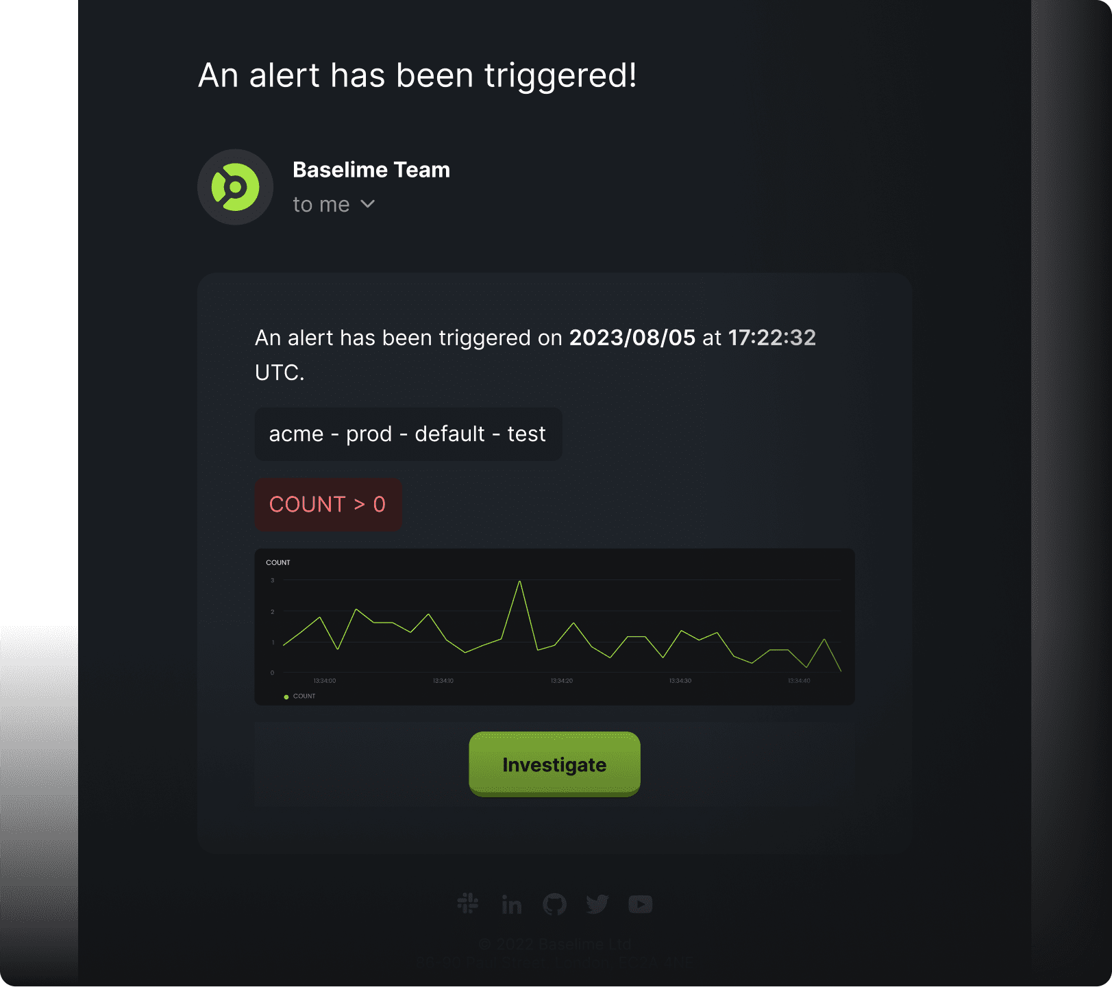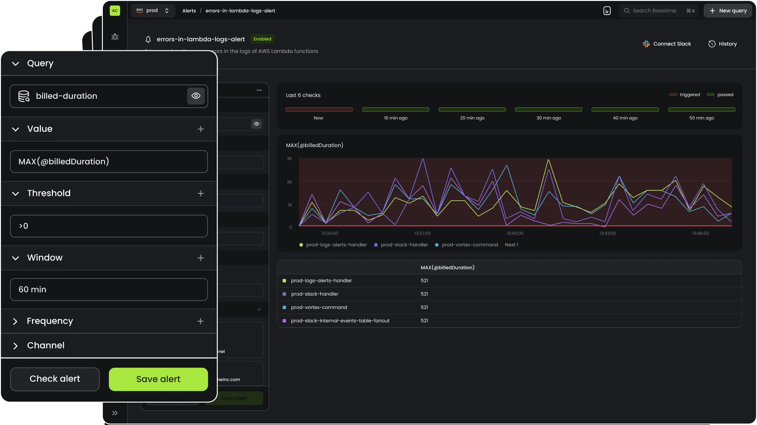 Baselime natively integrates with Slack and webhooks for alerting. The possibilities are limitless.