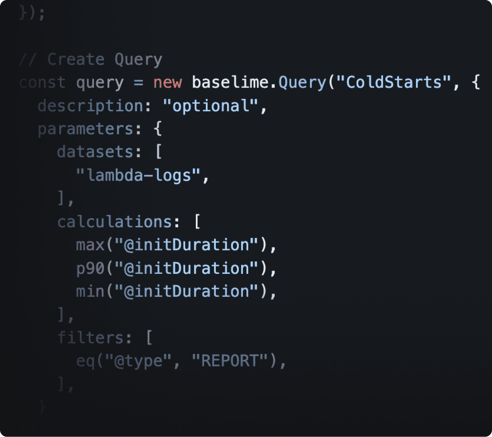 With Baselime's Observability as Code, you can manage your entire observability lifecycle without ever leaving your code editor. Create alerts as you are building your application, without loosing any context.